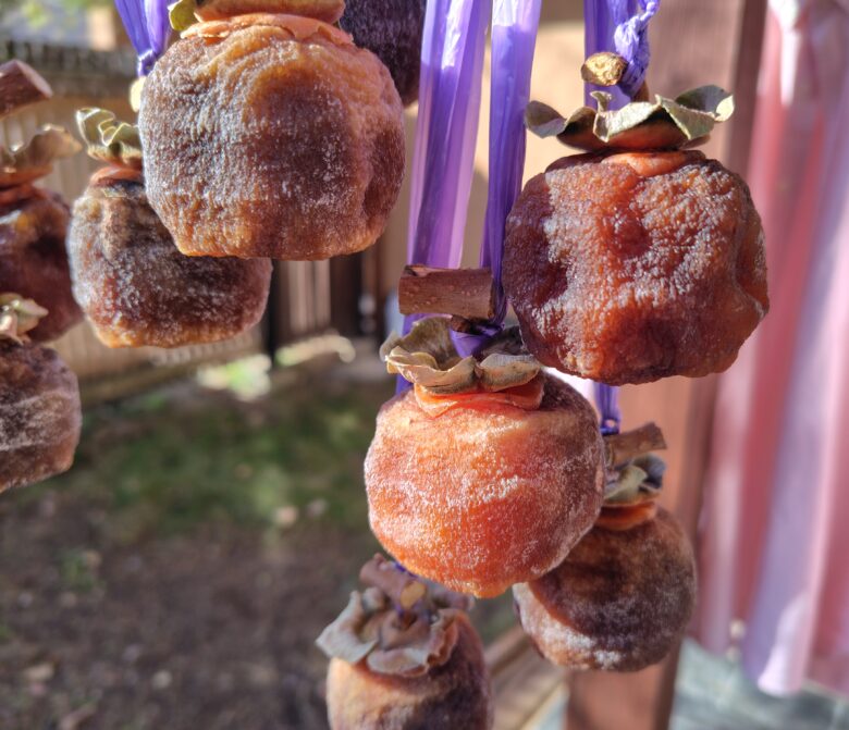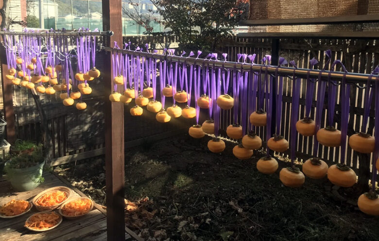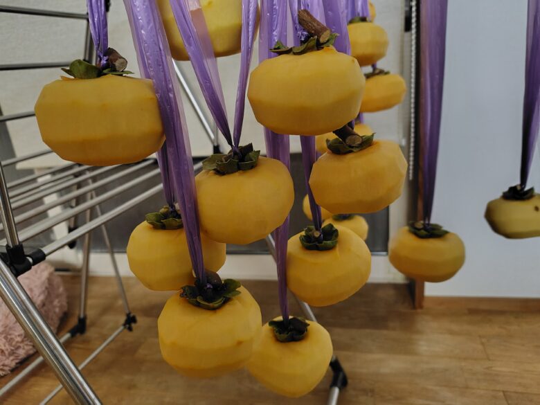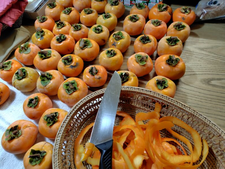うちでも妻が、もらってきた柿を剥いて外に吊るし、雨が降りそうになると部屋の中に吊るしてます。