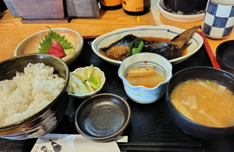 日替わりランチのカレイの煮付け・刺身・味噌汁はとっても美味。