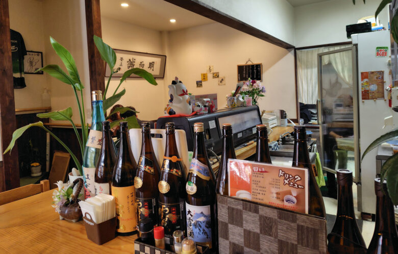 内装や外観は「小洒落た店」の対極で、安っぽい招き猫・造花・書画や一升瓶がこだわりなく並んでるが、