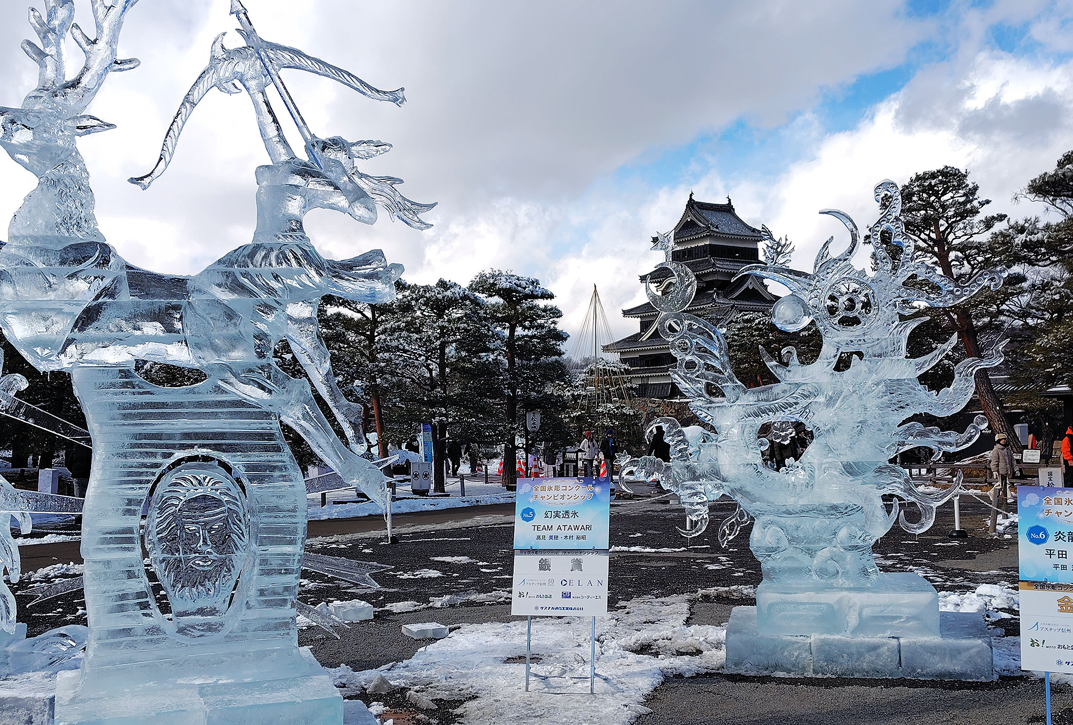 子どもに人気の恒例の氷の滑り台最低気温が-10℃前後にもなる真冬、信州で氷の彫刻を制作して展示するイベントが開かれます。その一つが松本城で行われる「氷彫フェスティバル」で、長野県内外から十数組の氷彫刻家の職人たちが、寒い中、夜を徹して氷で彫刻を制作してコンクール形式で腕を競います。制作された氷の彫刻は、松本城をバックに屋外で展示され、人々を魅了します。近年は、国内外の一流の氷彫制作者も招かれています。