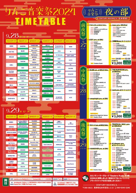 ライブハウスやクラブで活躍しているミュージシャンの他、全国的に著名なアーティストも多く参加し、「りんご」「そば」「おやき」など、信州をイメージさせる7つのステージ毎に趣向を変えたラインナップを楽しめます。