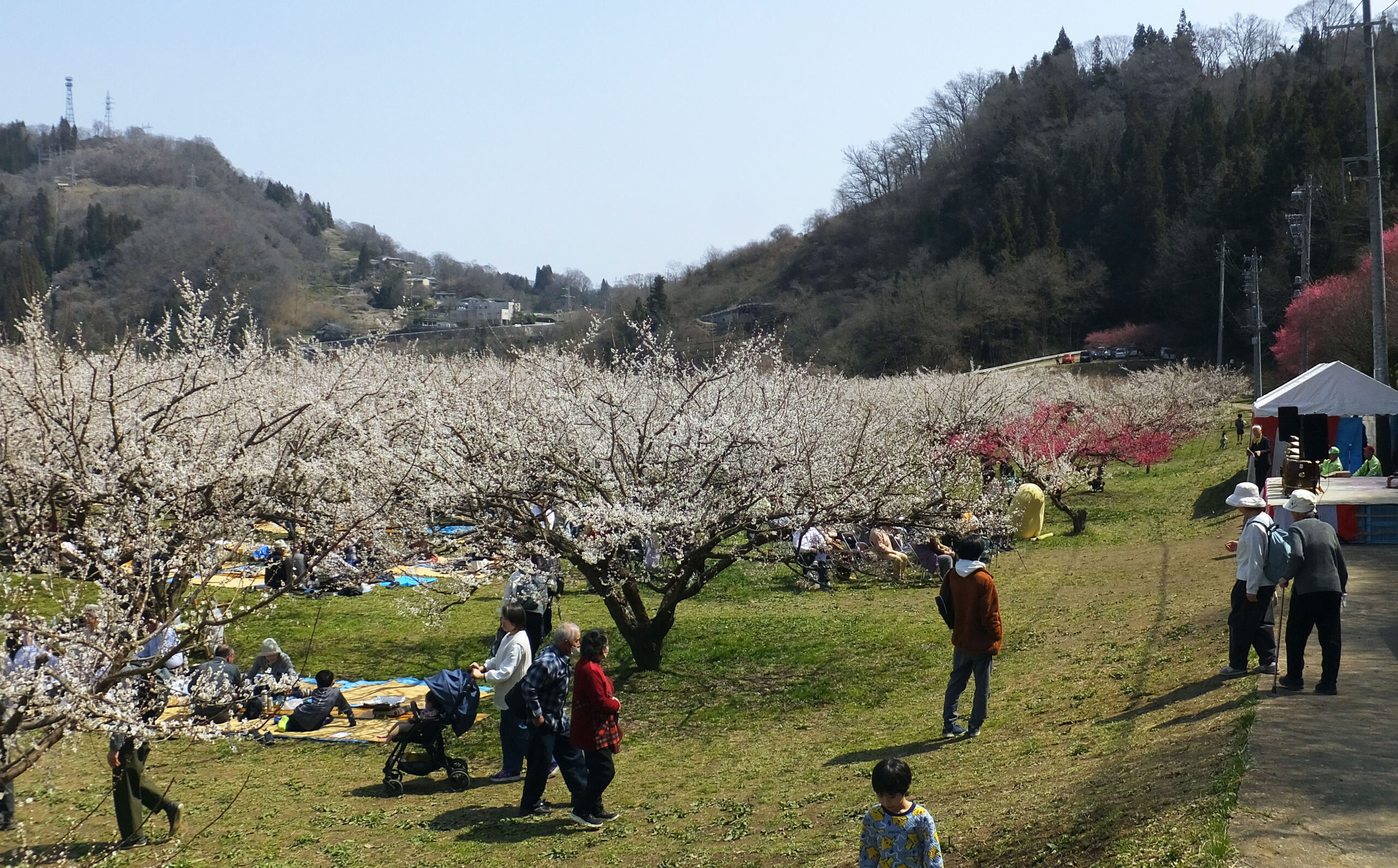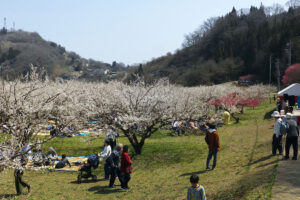 満開の時期の土日に、花祭りのイベントとして、梅園内「ジンギスカン宴会場」として、信州新町のローカルフードの羊肉の焼肉のコンロセットとござが用意されていて、手ぶらで梅の花見バーベキューが楽しめます。