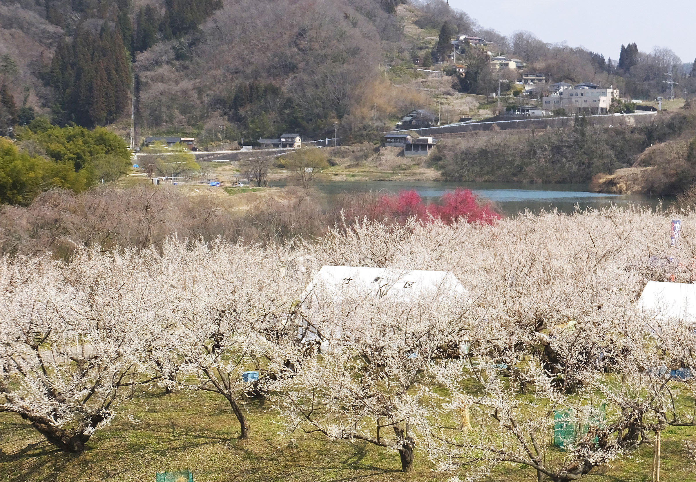 国道19号は犀川とそれをせき止めたダム湖のすぐ横を通る道で、ろうかく梅園は橋を渡ったところにあります。梅に加えて、美しいグリーン色のダム湖の景色も楽しめます。