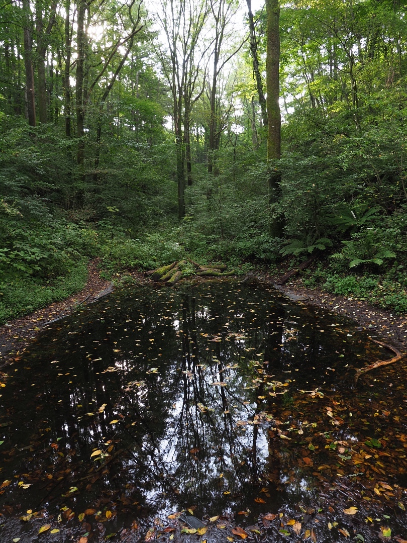 元の道に引き返して5分ほどで左に分岐します(あずまやからさらに奥に行くコースもあります)。ゆっくり下ると、左側に「ドングリ池」が見えてきます。名前通り、遊歩道で秋は栗やドングリが拾えます。池の近くに下りてみると、意外と水は澄んでいて、水生動物が泳いでいるのが見えます。