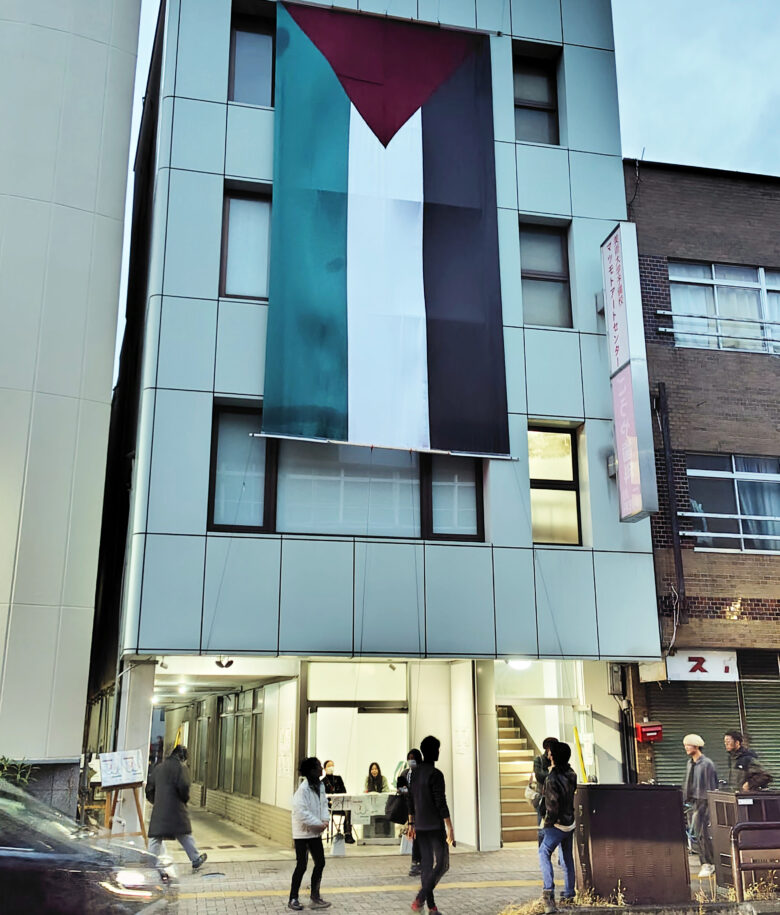 パレスチナの大きな国旗が下げられたり、パレスチナ支援グッズの販売コーナーもあって熱気ムンムン。