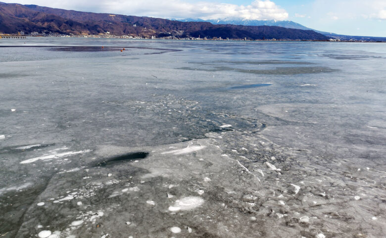 なので、今年の寒波で8シーズンぶりに起きるか期待されている御神渡りは、今年も見られなさそうです。